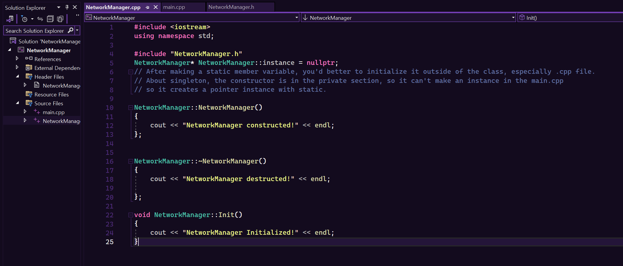 - And with the keyword 'new', assign the NetworkManager pointer to the static member pointer variable.